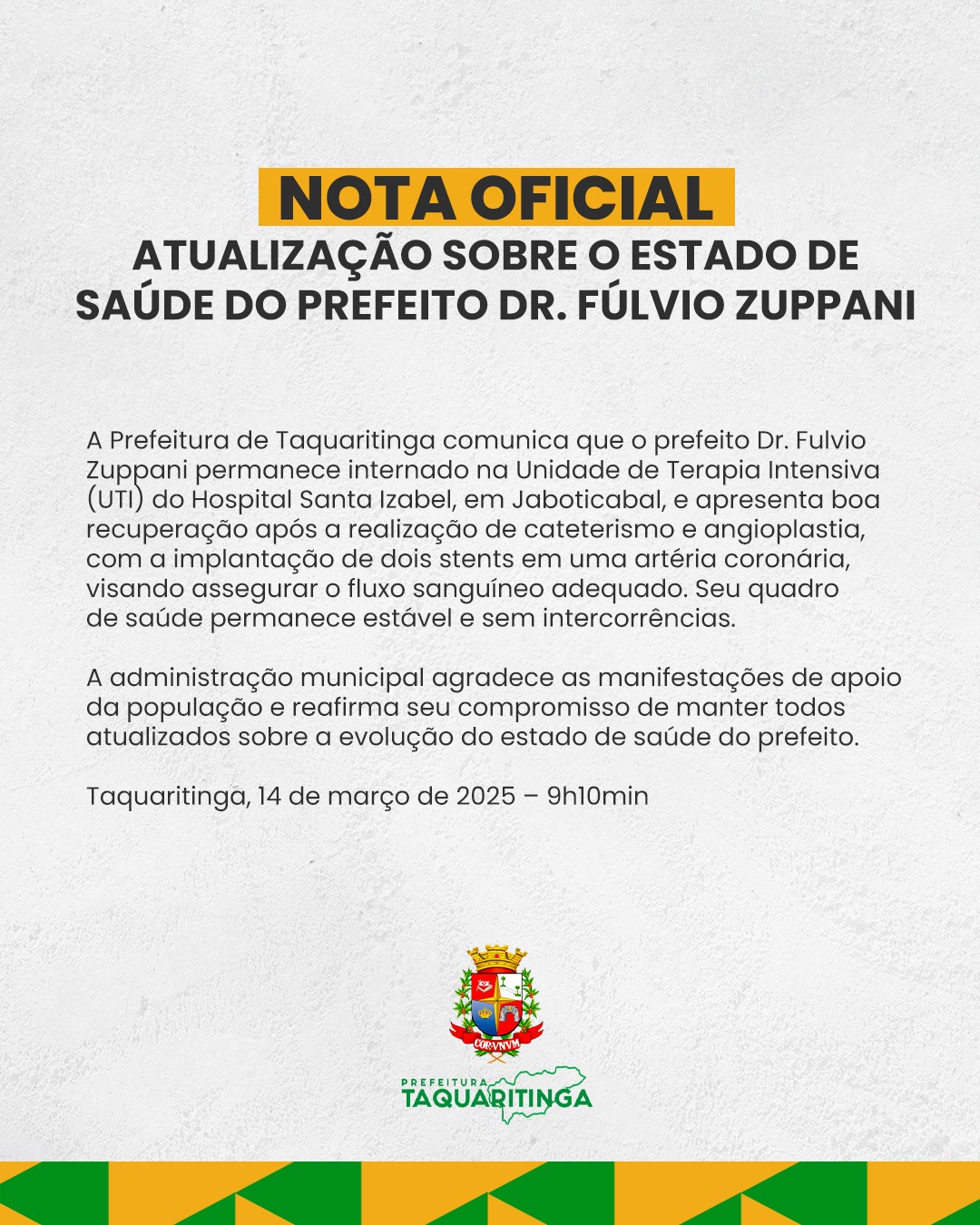 De acordo com a Prefeitura de Taquaritinga, o chefe do Executivo, que também é médico, apresenta boa recuperação, com quadro de saúde estável e sem intercorrências. “A previsão é de que ele retorne às suas atividades na próxima semana”, informou a administração municipal por meio de nota oficial divulgada na manhã desta quinta-feira (14).