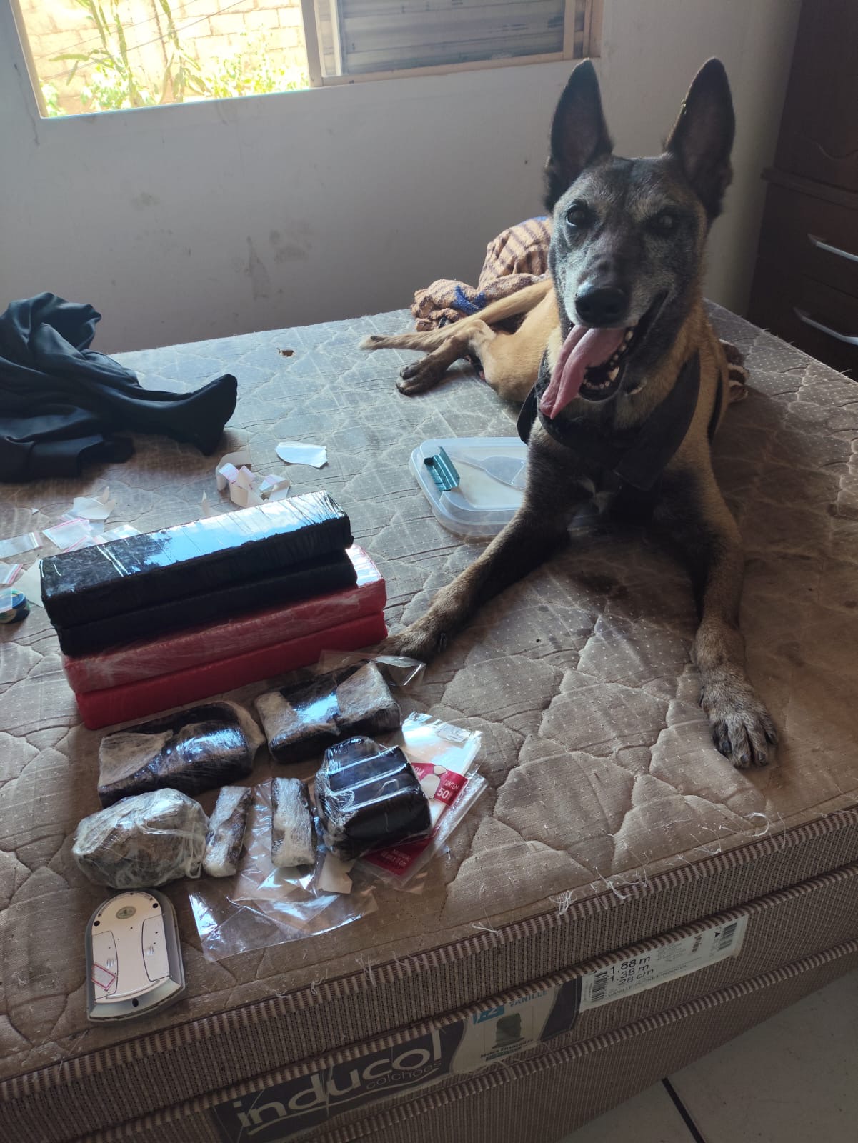 Ao passar pelo apartamento 1B, do bloco 4B, a K9 Atena indicou odor de drogas na janela do quarto. O morador, localizado na lavanderia, autorizou a entrada da equipe. Durante a busca interna, a cadela voltou a sinalizar — desta vez para a gaveta e a parte superior do guarda-roupas — onde foram encontrados entorpecentes e materiais relacionados ao tráfico.