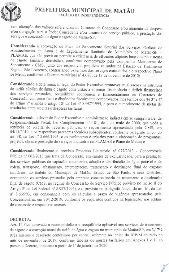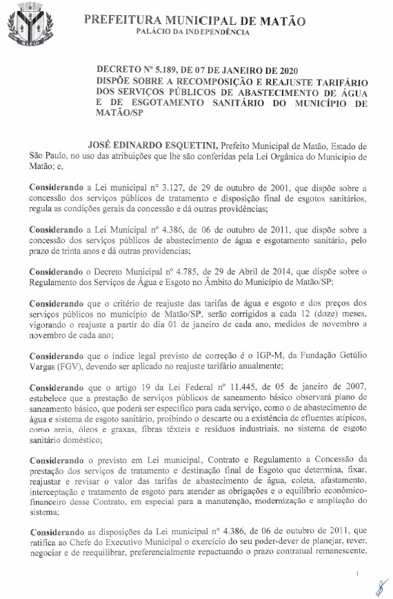 Ao reunir decretos antigos para atender às solicitações do MP, o secretário teria descoberto que o decreto do governo Esquetini continha os “considerandos” que mencionam a recomposição e reajuste tarifário dos serviços públicos de abastecimento de água e de esgotamento sanitário do município de Matão — porém sem que a Prefeitura tivesse os documentos internos que fundamentariam tal decisão. Vindo a tona não um reequilíbrio, mas sim uma prorrogação de contrato.