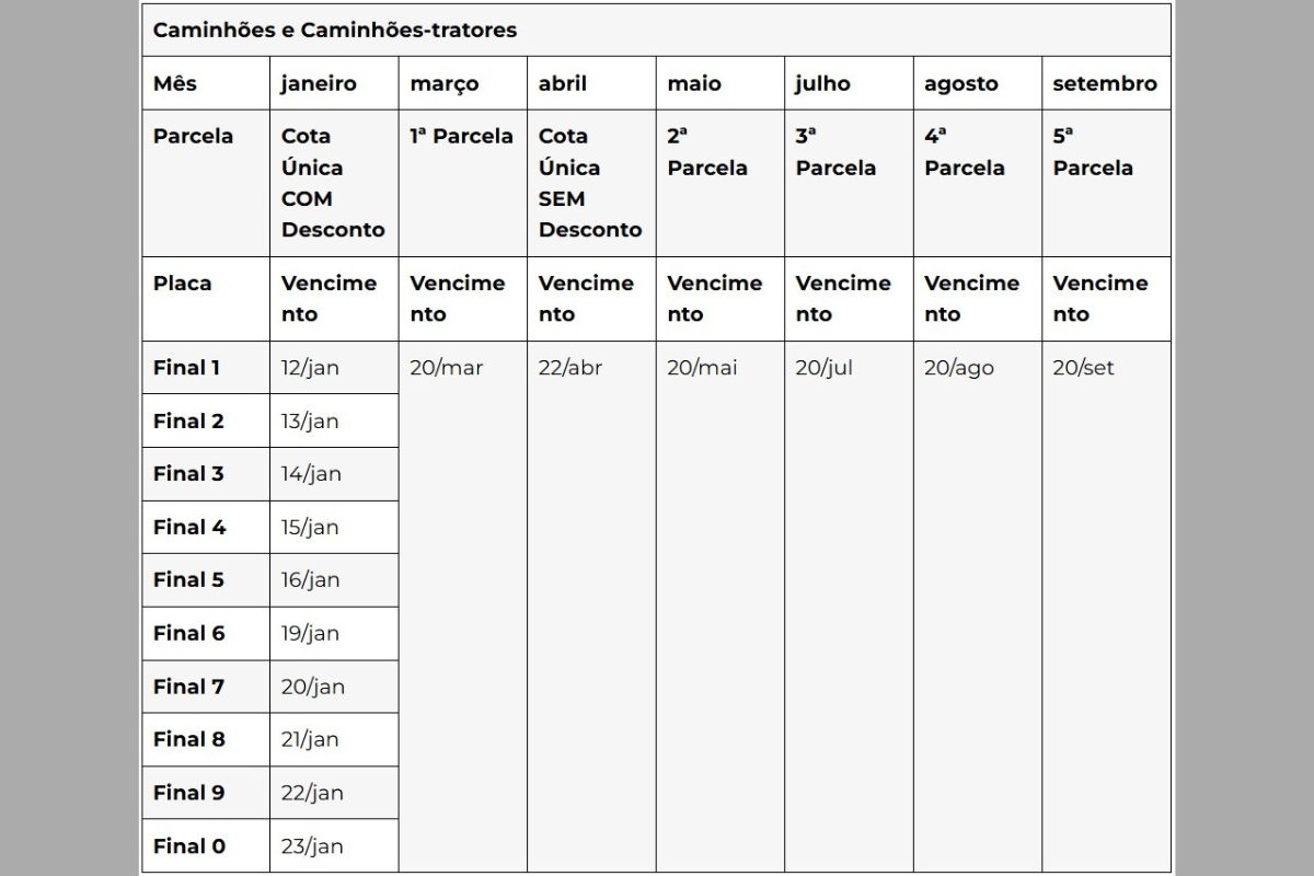 Os caminhões têm prazos diferenciados: para o pagamento integral em janeiro é concedido desconto de 3%; aos que escolherem pagar em cota única, sem desconto, é 22 de abril. Para os proprietários que optarem pelo parcelamento em três, quatro ou cinco vezes, sem desconto, os vencimentos são em 20 de março, 20 de maio, 20 de julho, 20 de agosto e 20 de setembro.