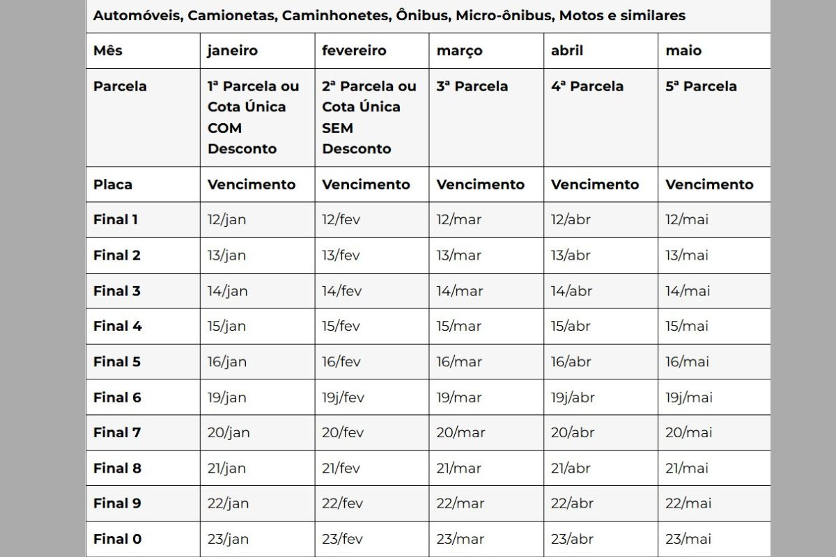 Os proprietários poderão escolher entre as seguintes formas de pagamento com vencimentos de acordo com o final de placa do veículo: