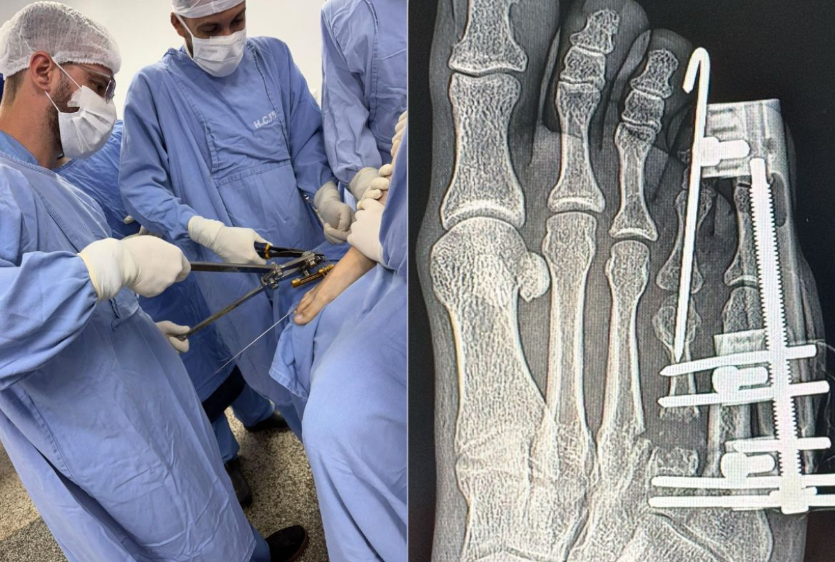 A cirurgia foi conduzida pelo ortopedista Dr. Lucas Alcaide Thomaz, profissional com experiência prévia nesse tipo de correção, e contou com o apoio de equipe anestésica especializada e a presença de diversos médicos ortopedistas, que acompanharam o procedimento de forma técnica e observacional.