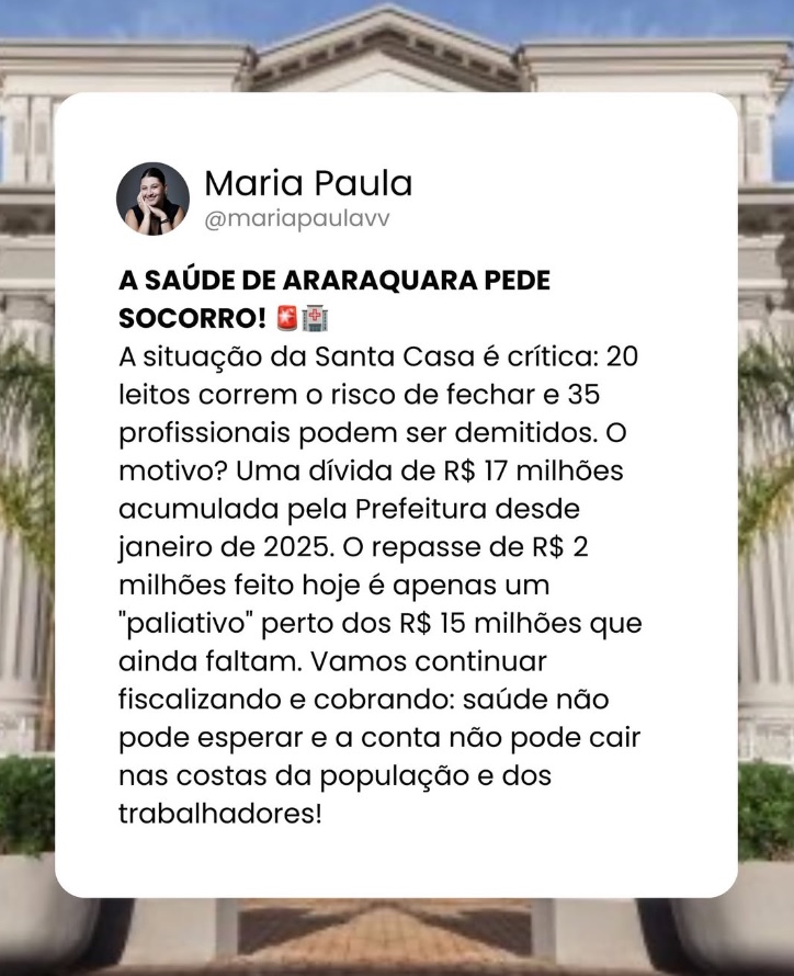 “A saúde de Araraquara pede socorro”, diz a vereadora Maria Paula; dívida de R$ 17 milhões agrava filas e coloca atendimentos em risco.